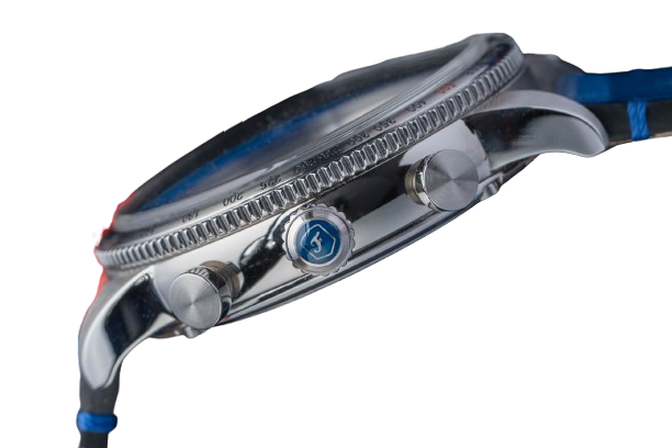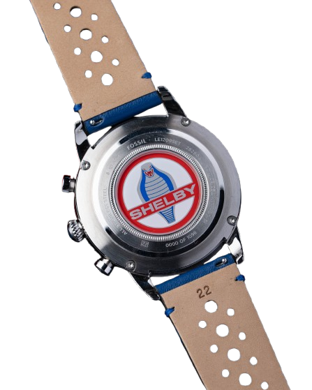 Dominated by Shelby’s signature blue-and-white “Wimbledon White” stripes, the dial unites sport and structure. A trio of subdials tracks elapsed time, while white hands, bold numerals, and Cobra branding evoke a strong racing aesthetic. Though the overlapping white elements slightly affect legibility, it still conveys a compelling motorsport narrative.