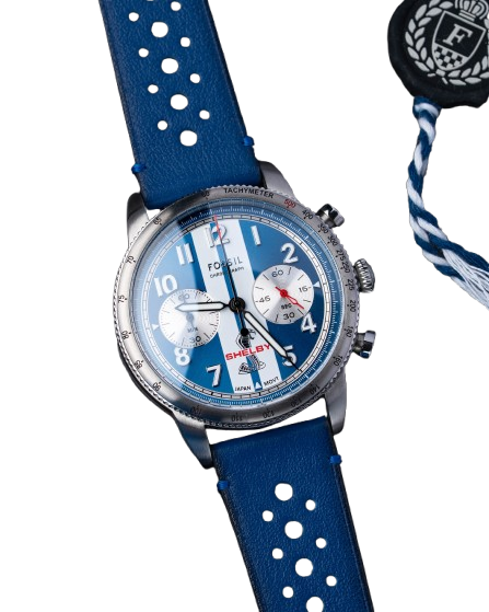 The latest collaboration from Fossil, the Shelby Grand Tourer, wears its Shelby-American credentials proudly. Engineered with a 44–45 mm brushed steel case, sapphire crystal, and a fixed tachymeter bezel, it channels automotive precision with an everyday-ready build.